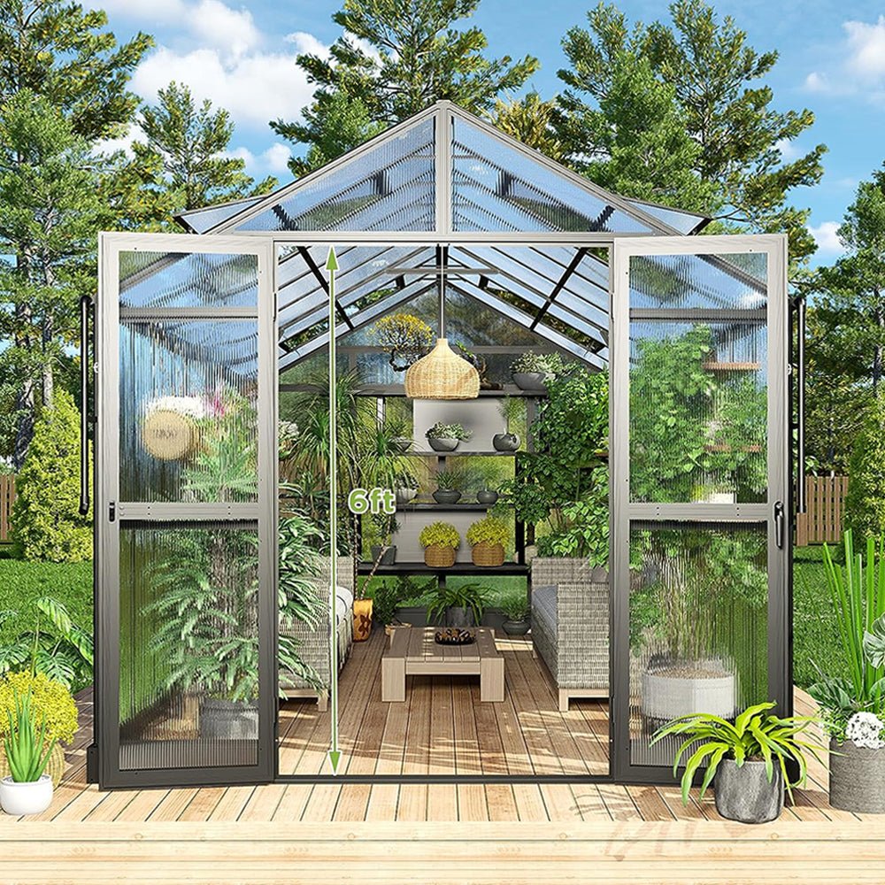 You'll be a pro gardener in no time with this Heavy Duty Outdoor Polycarbonate Patio Greenhouse! The perfect place to nurture seedlings or heat-loving plants all year round, it boasts 6mm twin-wall PC panels that provide up to 99.99% UV Protection and a 5.2FT wall height that eliminates the need for bending. Plus, you can easily adjust the temperature with two swing doors and four adjustable ventilators!
