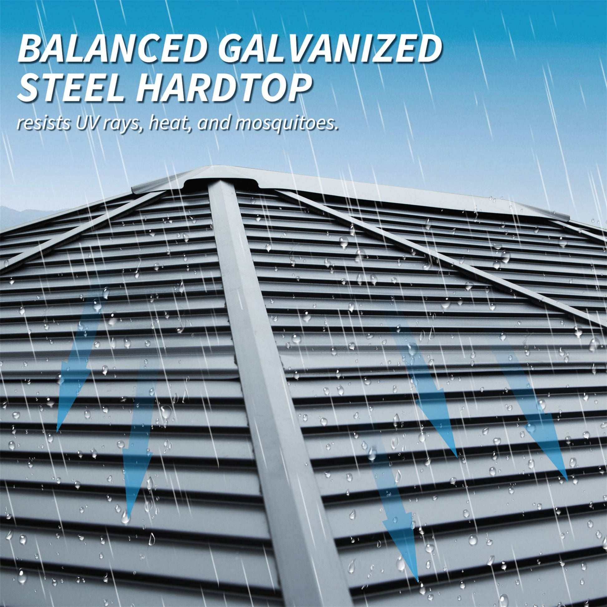 - The sloped galvanized steel roof is engineered to resist strong winds and harsh weather while efficiently directing rainwater away to prevent water buildup.