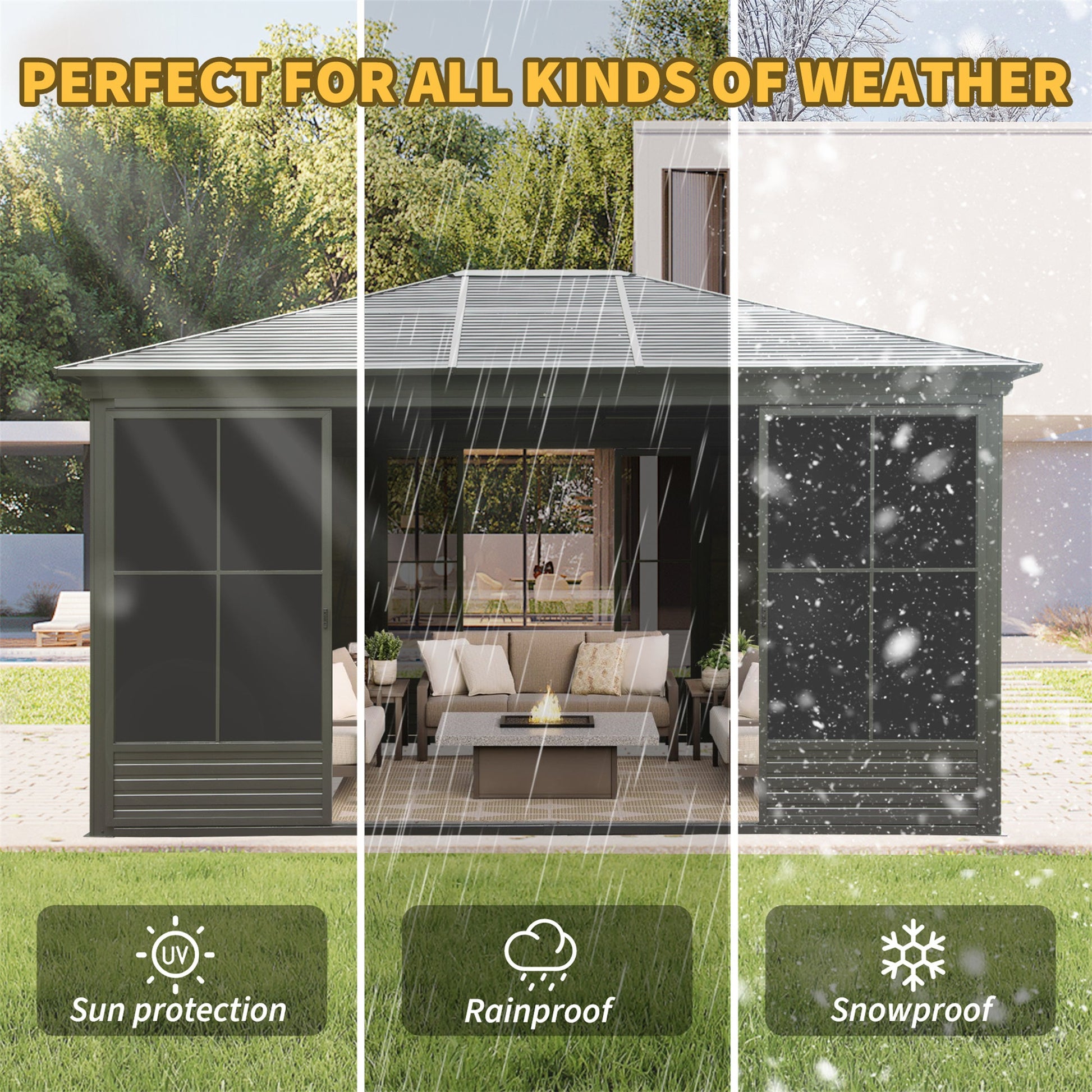 - Designed for year-round comfort, this enclosed gazebo is perfect as a lounge area, workspace, spa enclosure, or stylish outdoor retreat.