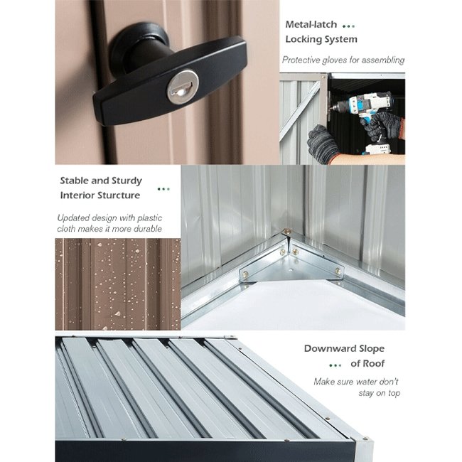 - Utility shed with a durable structure, using panels of thickened galvanized steel for better reinforcement, functional tool shed under all kinds of weather conditions.