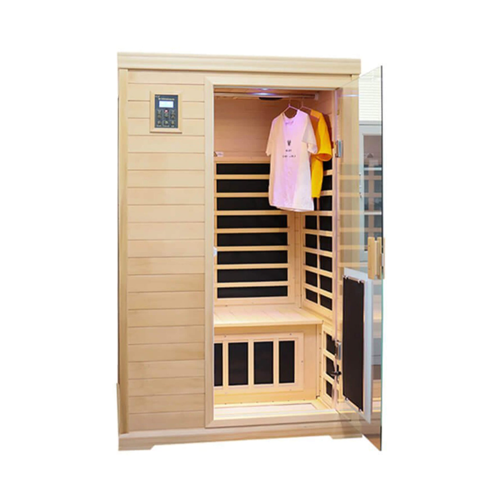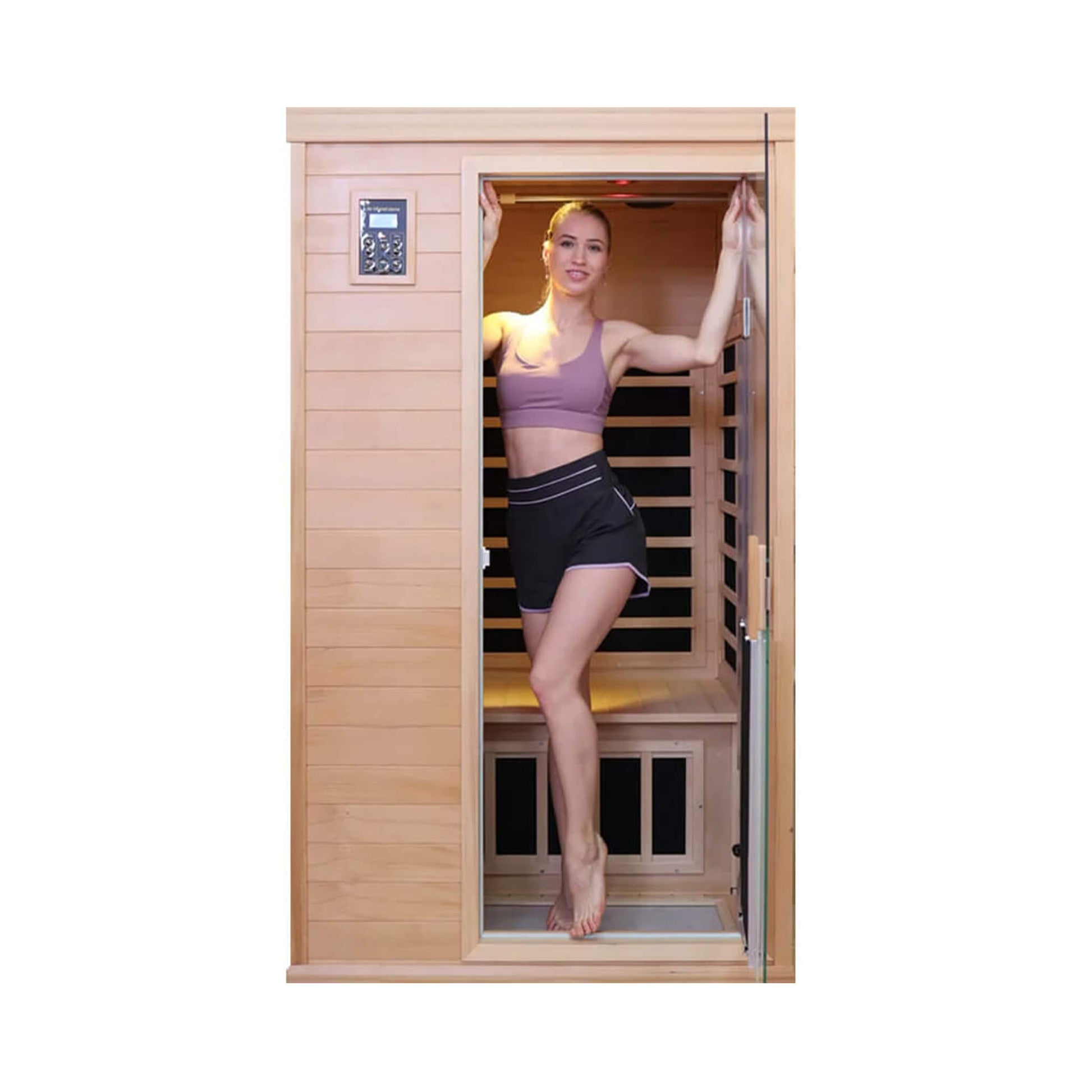 Constructed from premium Canadian hemlock wood, this sauna combines natural beauty with exceptional durability and heat retention. The aromatic hemlock creates a serene, spa-like atmosphere while resisting moisture and maintaining its gorgeous appearance for years to come. With spacious seating for two, you can enjoy relaxing sessions with a partner or stretch out comfortably on your own!