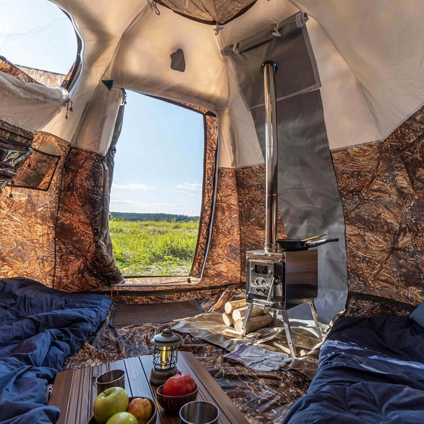 UP2 MINI – is a popular small hot tent by RBM Outdoors. The tent itself is not huge, but roomy enough to fit a company of 3 people. You can take this hot tent and go camping, hiking, fishing or even hunting with your closest friends. Thanks to quick & easy assembly you won’t waste time reading long manuals, while your friends are freezing. You just pop it up, like an umbrella and it is almost done. This tent has two independent layers: Outer - is made of moisture-resistant Oxford 300 PU 4000 fabric. Inner - is made of Oxford 210 fabric with moisture-repellent impregnation of PU 2000 mm. There is air layer between them, which helps to keep warmth inside, and cold outside. Moreover, this model has a stove jack, so you can order and install a wooden stove and create the most comfortable atmosphere inside, while it is freezing and windy outside. Check wood stove Caminus S by RBM Outdoors. The winter tent has removable heat-resistant fabric that can withstand up to 1200 °C (2190 ℉). The chimney stainless steel ring does not allow the hot pipe of the woodstove to touch the structure of the arctic tent, preventing fire accidents. The frame of this artic tent is made of aviation aluminum alloy B95T1 with rod diameter 8mm (0.32”). The dome shape improves aerodynamic features of the tent, making it easier to withstand any winds. Quick installation takes 3 minute.