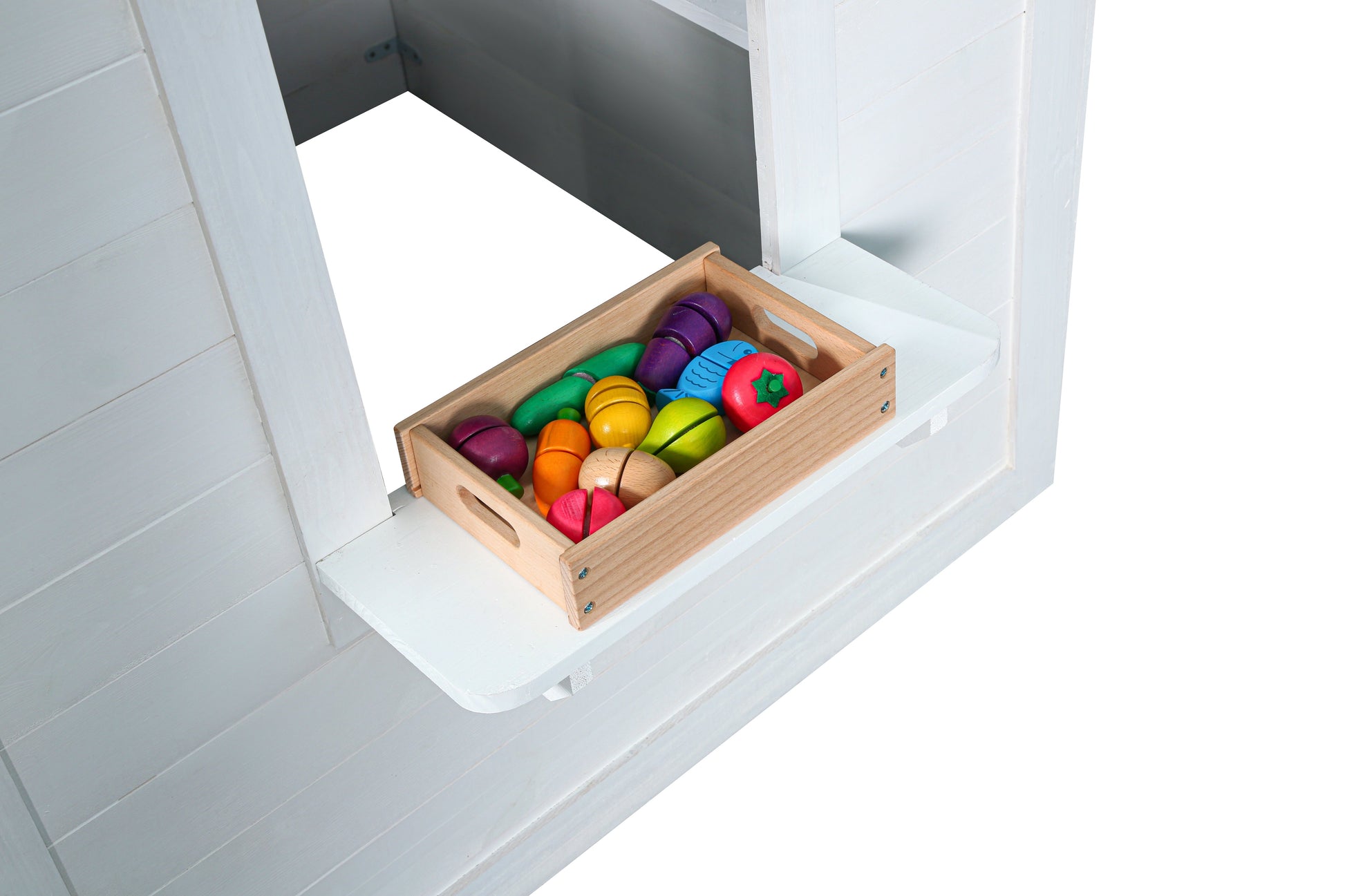 2MamaBees Zahara Playhouse will create hours of sensory play while also helping your little one explore the world of imagination. The beautiful white and black farmhouse design will create a stunning addition to any backyard. The Zahara Playhouse includes a built-in kitchen, beautiful wooden play food and cedar window boxes to create your own potted garden.